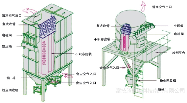 正常工作時(shí),在系統(tǒng)風(fēng)機(jī)的作用下,含塵氣體吸入進(jìn)氣總管,通過各進(jìn)氣支管均勻地分配到各進(jìn)氣室,然后涌入濾袋,大量粉塵被截留在濾袋表面上,而氣流則透過濾袋達(dá)到凈化。凈化后的氣流通過袋室沿管路通過風(fēng)機(jī)進(jìn)入煙囪而排入大氣。